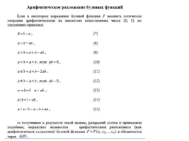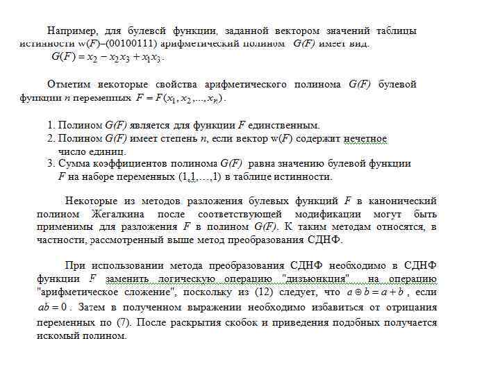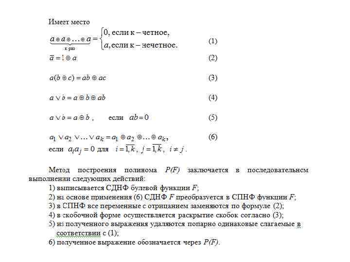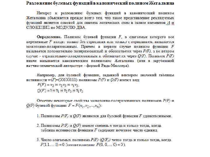 Основным достоинством представления булевых функций в виде канонического поли нома Жегалкина является то, что в этом представлении любая булева функция задается с помощью всего двух логических операций: конъюнкции и сложения по модулю два, что сокращает набор различных элементов для синтеза логических схем. Опишем метод построения канонического полинома Жегалкина P(F) путем преобразования СДНФ для произвольных булевых функций n пе ременных , заданных посредством таблицы истинности. F Предварительно отметим основные свойства логической операции сложения по модулю два, которые используются при описании метода.