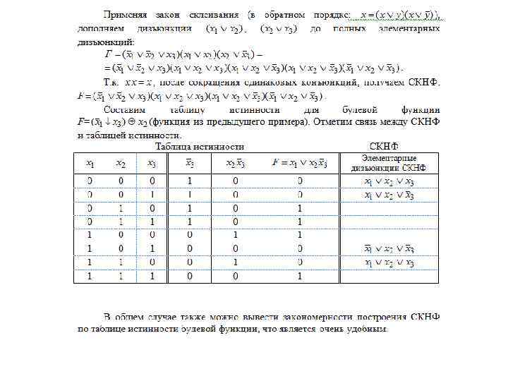 СКНФ состоит из конъюнкций полных элементарных дизъюнкций наборов переменных , на которых функция принимает значение 0. Переменные берутся без отрицания, если им соответствует в таблице истинности 0, с отрицанием, если 1. • Свойства СКНФ – СКНФ не имеет двух одинаковых макстермов – Ни один макстерм СКНФ не содержит двух одинаковых множителей – Ни один макстерм СКНФ не содержит вместе с переменной ее отрицание