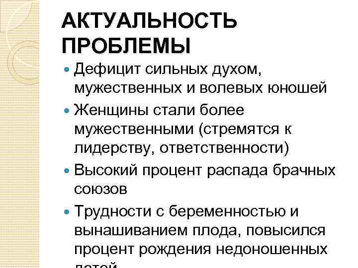 АКТУАЛЬНОСТЬ ПРОБЛЕМЫ Дефицит сильных духом, мужественных и волевых юношей Женщины стали более мужественными (стремятся к лидерству, ответственности) Высокий процент распада брачных союзов Трудности с беременностью и вынашиванием плода, повысился процент рождения недоношенных