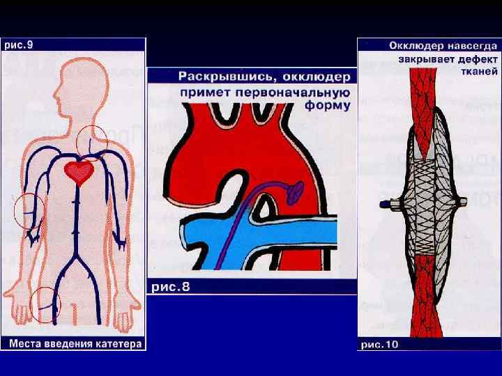 Из истории… В 1977 г. , эксперементируя на животных, ученые впервые попробовали исправить дефекты структур сердца иным способом: не ушивая их, а с помощью специального устройства окклюдера, т. е. заплатки, которая подводилась к проблемному месту через сосуд в свернутом виде и уже здесь расправлялась, навсегда закрывая дефект. Эксперимент дал хорошие результаты, и вскоре начались исследования уже с участием пациентов.