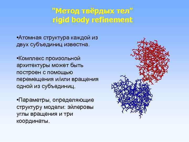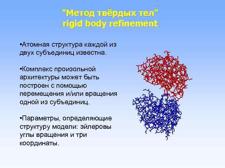 "Метод твёрдых тел" rigid body refinement • Атомная структура каждой из двух субъединиц известна. • Комплекс произольной архитектуры может быть построен с помощью перемещения и/или вращения одной из субъединиц. • Параметры, определяющие структуру модели: эйлеровы углы вращения и три координаты.