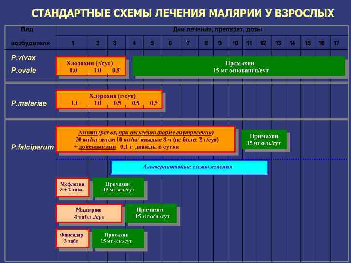 Препараты для лечения тяжёлой P. falciparum-малярии Хинин: хинина гидрохлорид внутривенно: 20 мг/кг в изотоническом р-ре глюкозы (10 мл/кг) в течение 4 ч затем по 10 мг/кг в изотоническом р-ре глюкозы в течение 4 ч каждые 8 ч до тех пор, пока больной начнет глотать. Далее хинина сульфат в таблетках по 10 мг/кг через 8 - 12 ч. Курс лечения 7 дней. + Доксициклин: 0, 1 г каждые 12 ч 7 дней в сочетании с хинином или Клиндамицин: 5 мг/кг каждые 12 ч 3 дня в сочетании с хинином или Артезунат (в/в): 2, 4 мг/кг в 1 -й день, далее по 1, 2 мг/кг/сут ежедневно не менее 3 дней или Артеметер (в/м): 3, 2 мг/кг в 1 -й день, далее по 1, 6 мг/кг/сут ежедневно не менее 3 дней