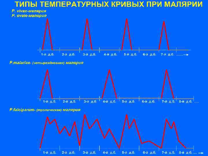 КЛИНИЧЕСКИЕ ПРИЗНАКИ МАЛЯРИИ • • ВЕДУЩИЕ СИМПТОМЫ: Общетоксический синдром с приступами лихорадки через 1 (P. falciparum-, P. vivax, P. ovale –малярия) или 2 (P. malariae –маля-рия) дня со стадиями «озноба» , «жара» и «пота» Анемия, преимущественно гемолитического типа Увеличение печени и селезенки У неиммунных лиц в течение первой недели болезни при P. falciparum- и P. vivax-малярии лихорадка часто имеет неправильный тип, анемия и гепато-спленомегалия выявляются в конце 1 -й – начале 2 -й нед болезни