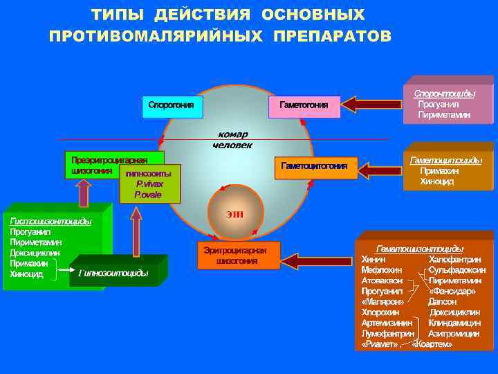 Алгоритм лечебно-диагностической тактики при малярии Провизорный диагноз малярии делает необходимым: ►Госпитализацию пациента в инфекционный стационар ► Микроскопию мазка и толстой капли крови (взятие препаратов крови производится независимо от уровня температуры в момент исследования. При отрицательном результате – повторное исследование крови через 8 -10 ч ►Назначение предварительного лечения, не дожидаясь результатов микроскопии крови ►Выбор препаратов проводят с учетом формы тяжести и сроков развития болезни, а также региона инфицирования