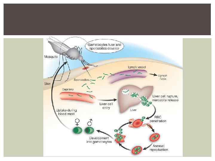 ЭРИТРОЦИТАРНАЯ ШИЗОГОНИЯ Цикл развития у М. malaria составляет 72 часа, у остальных видов – 48 часов В ходе каждого цикла в эритроцитах последовательно образуются трофозоиты (кольцевидные, юные, далее –амебовидныеи взрослые - шизонты), морула, распад, 4 -24 мерозоитов Цикл развития эритроцитарной шизогонии заканчивается разрушением зараженных эритроцитов и выходом подвижных мерозоитов в плазму крови, где часть их погибает, а остальные внедряются в новые эритроциты и происходят новые циклы шизогонии Часть мерозоитов превращается в гаметоциты (незрелые женские и мужские половые клетки, последующее их развитие происходит в желудке комара) Гаметоциты М. malaria , М. Ovale, М. Vivax, не попавшие в организм комара, быстро погибают, а гаметоциты М. falciparum способны длительно сохраняться в крови человека (несколько месяцев)