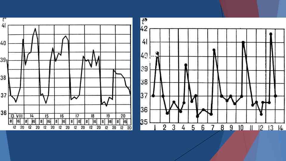Типичные малярийные пароксизмы разделяются промежутками нормальной температуры, при 3 хдневной малярии: повторяются через день, начинаются в первой половине дня, при 4 хдневной малярии: повторяются через 2 дня, может быть сдваивание приступов (день + ночь)