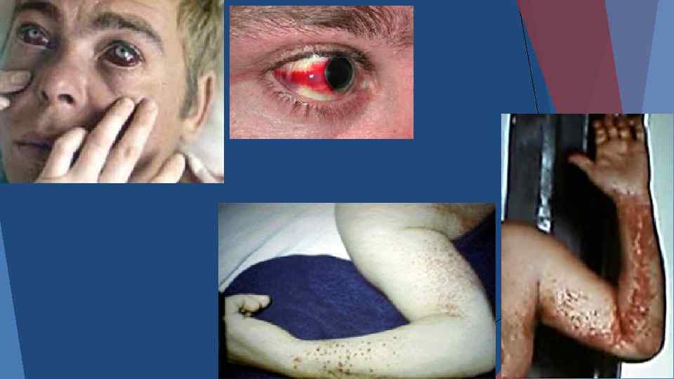 Геморрагический синдром: ü петехиальная сыпь на коже груди, в области подмышечных впадин, на внутренней поверхности плеч (полосы сыпи могут располагаться линиями, как от «удара плетью» ) ü кровоизлияния в склеры и конъюнктивы одного или обоих глаз так называемый симптом «красной вишни» .