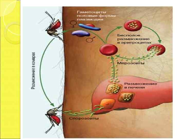 Жизненный цикл малярийного плазмодия 1. При укусе в кровь человека попадают спорозоиты (бесполое поколение). 2. С током крови они попадают в печень, где делятся путём шизогонии. Шизогония – это способ бесполого размножения, при котором ядро делится на множество частей, вокруг каждой возникает цитоплазма и клетка делится на много частей. 3. После нескольких делений в печени спорозоиты выходят в кровь и проникают в эритроциты. 4. В эритроцитах плазмодии также делятся шизогонией. В момент разрыва эритроцита в кровь выделяются токсины – ядовитые продукты жизнедеятельности плазмодия, которые вызывают лихорадку. 5. Через несколько таких делений плазмодии превращаются в клетки – предшественники гамет – гаметоциты. 6. При укусе гаметоциты попадают в организм комара, выходят из эритроцитов и превращаются в гаметы. 7. Гаметы попадают в кишечник комара и сливаются, образуя оплодотворённую яйцеклетку – зиготу. 8. Зигота попадает в гемолимфу комара, где делится => образуются спорозоиты. 9. Спорозоиты попадают в слюнные железы комара. 10. Цикл повторяется.