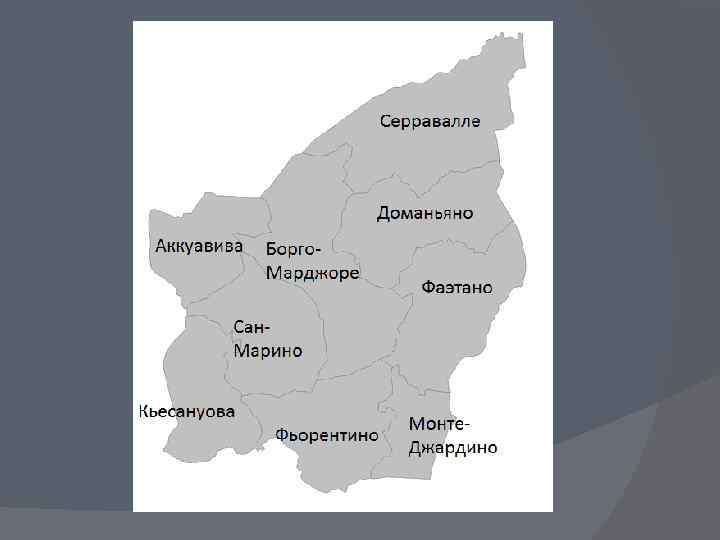 Официальный язык: итальянский. Столица: Сан-Марино. Крупнейший город: Серравалле. Форма правления: парламентская республика. Территория: 61 км² (190 -ая в мире). Валюта: Евро. Часовой пояс: +1 (отстает от московского на 2 часа).