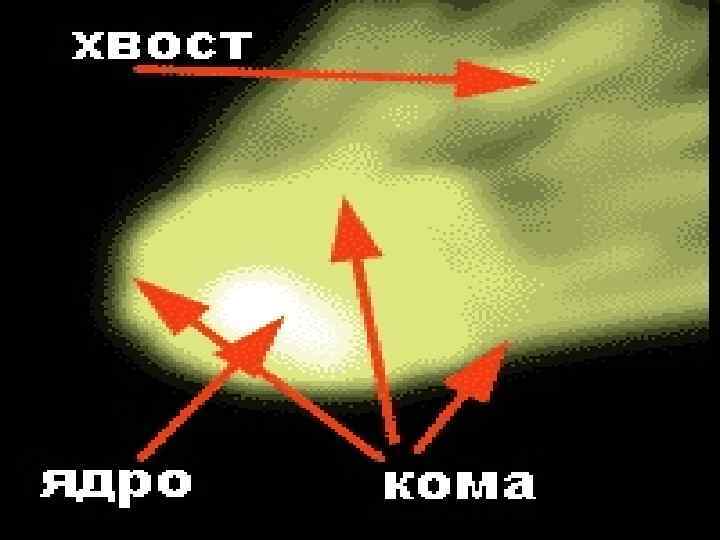 ЯДРО КОМЕТЫ НА БОЛЬШОМ РАССТОЯНИИ ОТ СОЛНЦА КОМЕТА ПРЕДСТАВЛЯЕТ СОБОЙ ГОЛОЕ ЯДРО - КОМ КОСМИЧЕСКОЙ ПЫЛИ, КАМНЕЙ, ЗАМЕРЗШИХ ГАЗОВ (ВОДА, МЕТАН, АММИАК). РАЗМЕРЫ ЯДРА ПО КОСМИЧЕСКИМ МАСШТАБАМ НЕВЕЛИКИ – КИЛОМЕТРЫ ИЛИ ДЕСЯТКИ КИЛОМЕТРОВ.