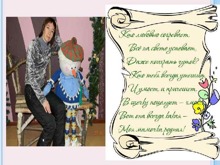 Кто на свете всех милее И теплом своим согреет, Любит больше, чем себя? Это МАМОЧКА моя.