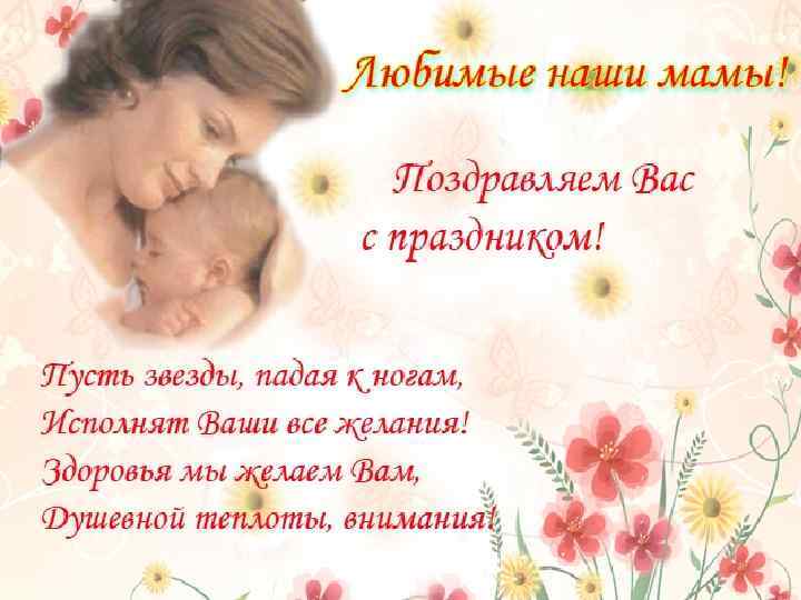 Мамочка любимая, Ты самая красивая. Сегодня праздник твой Мы празднуем с тобой. Побольше тебе радости, Тепла, цветов и сладостей Желаю я любя. С Днем матери тебя!