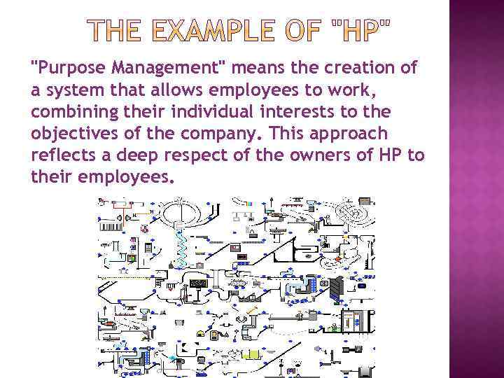 "Purpose Management" means the creation of a system that allows employees to work, combining their individual interests to the objectives of the company. This approach reflects a deep respect of the owners of HP to their employees.
