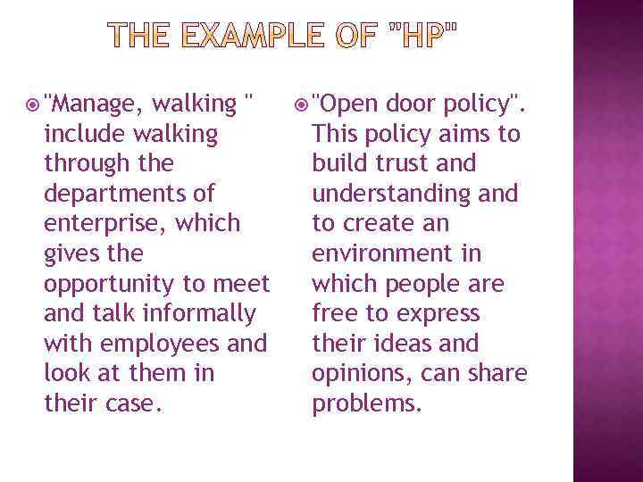 "Manage, walking " include walking through the departments of enterprise, which gives the opportunity to meet and talk informally with employees and look at them in their case. "Open door policy". This policy aims to build trust and understanding and to create an environment in which people are free to express their ideas and opinions, can share problems.