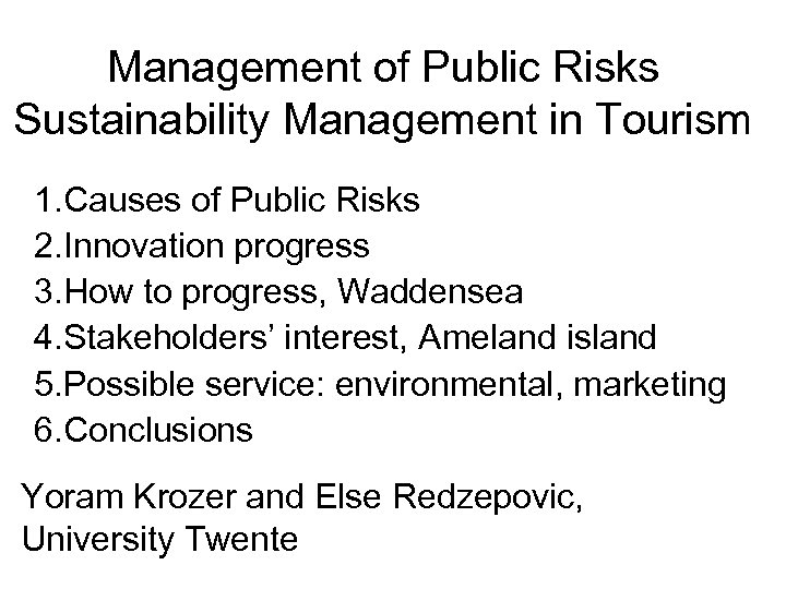 Management of Public Risks Sustainability Management in Tourism 1. Causes of Public Risks 2. Innovation progress 3. How to progress, Waddensea 4. Stakeholders’ interest, Ameland island 5. Possible service: environmental, marketing 6. Conclusions Yoram Krozer and Else Redzepovic, University Twente