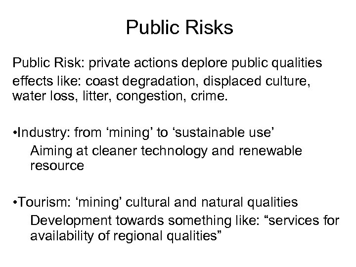 Public Risks Public Risk: private actions deplore public qualities effects like: coast degradation, displaced culture, water loss, litter, congestion, crime. • Industry: from ‘mining’ to ‘sustainable use’ Aiming at cleaner technology and renewable resource • Tourism: ‘mining’ cultural and natural qualities Development towards something like: “services for availability of regional qualities”