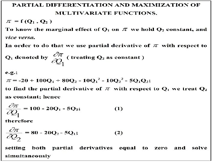 Partial Differentiation Economic relationships usually involve several independent variables. A partial derivative is like a controlled experiment- it holds the “other” variables constant Suppose price is increased, holding the disposable income of the economy constant as in Q = f (P, I ) then Q/ P holds income constant.