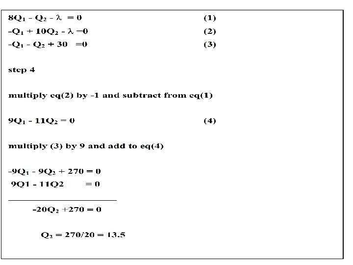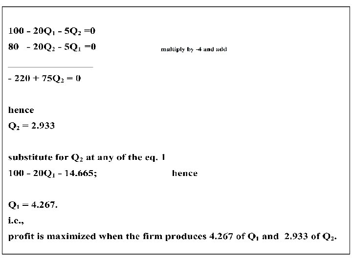 2 equations & 2 unknowns 200 - 20 X + 20 Y= 0 100 - 40 Y + 20 X = 0 Adding them, the -20 X and +20 X cancel, so we get 300 - 20 Y = 0, or Y =15 Plug into one of them: 200 - 20 X + 300 = 0, hence X = 25 To find Sales, plug into equation: S = 200 X + 100 Y -10 X 2 -20 Y 2 +20 XY = 3, 250