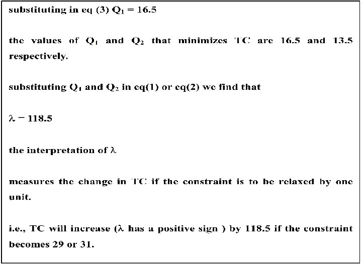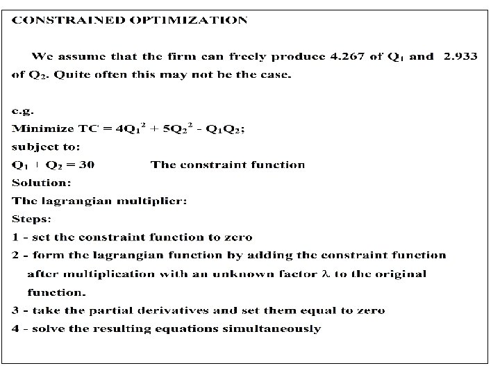 More Applications of Calculus minimization problem: Cost minimization supposes that there is a least cost point to produce. An average cost curve might have a U-shape. At the least cost point, the slope of the cost function is zero. The first order condition for a minimum is that the derivative at that point is zero. If TC = 5 Q 2 – 60 Q, then d. C/d. Q = 10 Q - 60. Hence, Q = 6 will minimize cost Where: 10 Q - 60 = 0.