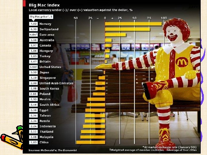 Иллюстрация теории ППС • Пример: если цена единицы товара в России 30 рублей, а в США — 2 доллара, то курс рубля к доллару должен составлять 15 рублей за доллар. Если курс составляет 25 рублей за доллар, то покупая товар в России (за 30 рублей), продавая в США (за 2 доллара) и обменивая 2 доллара на 50 рублей по текущему курсу, на каждой такой сделке можно получать доход, составляющий 20 рублей на единицу товара. Соответственно, цены на товар в США будут снижаться, цена на товар в России — расти, а курс доллара к рублю — также снижаться. В итоге будет достигнуто равновесие на новом уровне цен и курса (к примеру, товар стоит 1, 7 долларов в США, 34 рубля в России, курс доллара — 20 рублей за доллар).