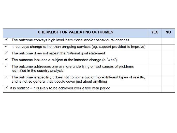 Typical pitfalls • Wordy (. . and no change language) “To promote equitable economic development and democratic governance in accordance with international norms by strengthening national capacities at all levels and empowering citizens and increasing their participation in decision-making processes. . . ” • Too ambitious “Strengthened rule of law, equal access to justice and the promotion of rights. . . ” • Containing multiple results “The state improves its delivery of services and its protection of rights—with the involvement of civil society, and in compliance with its international commitments …”