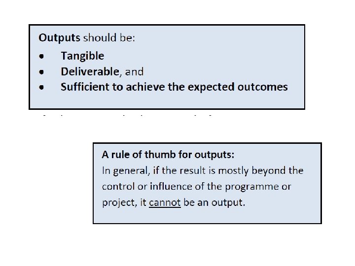 Output Result Immediate, visible, concrete developmental change that is the tangible consequence of project activities (inputs) § Commonly expressed in terms of individuals/groups § Should be achieved by the mid-point of a project