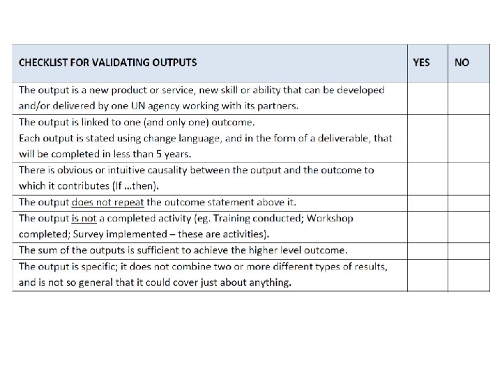 When all results have been consolidated into one matrix (logframe, UNDAF, AWP) go back and check the “if then” logic n the Strategic Result if n the Programme Result n the if Result if