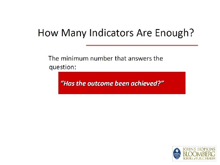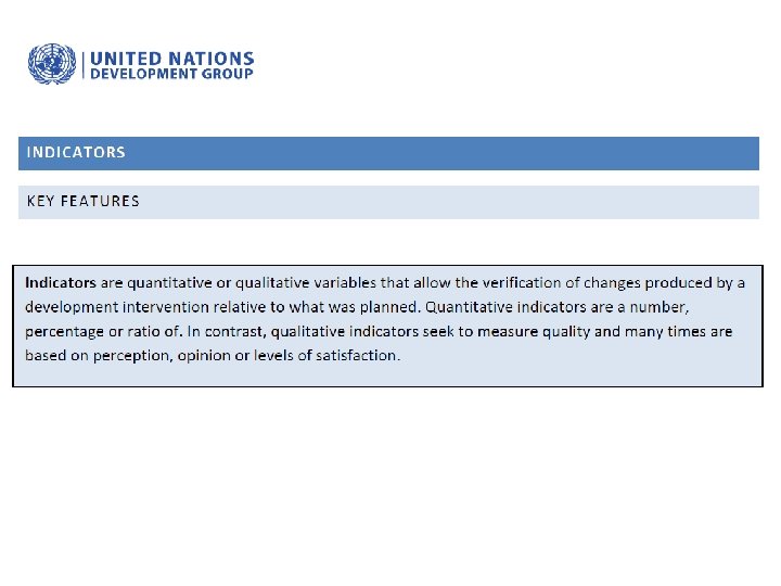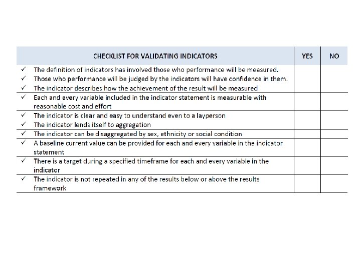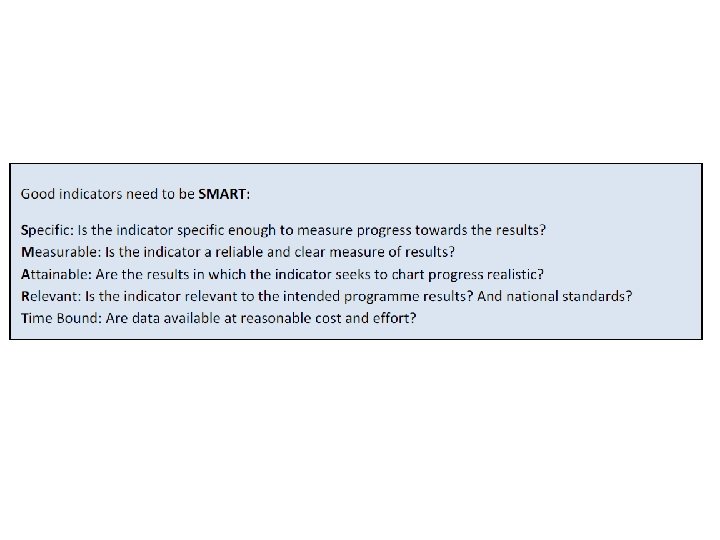 Indicators § Indicators describe how the intended results will be measured - accountability § Objectively verifiable, repeatable measures of a particular condition § They force clarification of what is meant by the result ……. the fine print! § Must be accompanied by baselines and targets