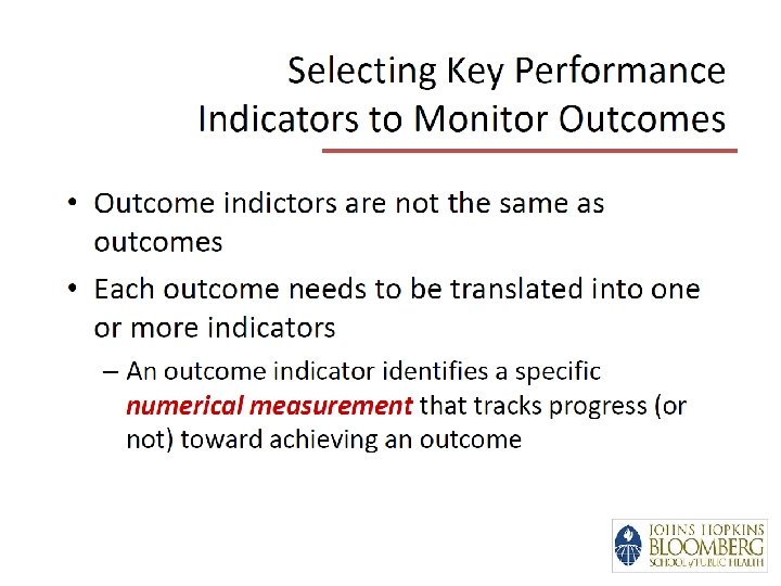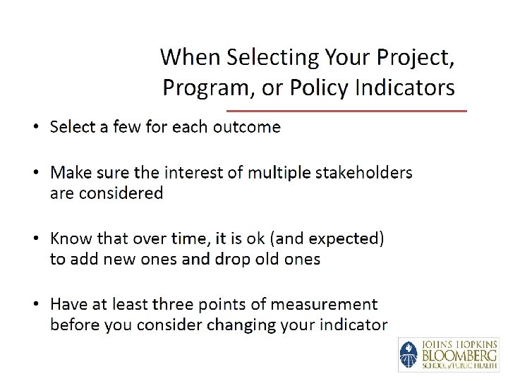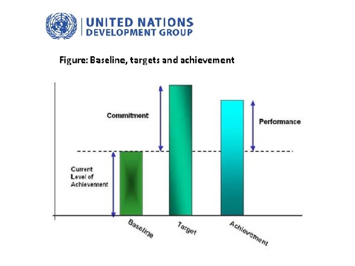 Indicators • All indicators must be accompanied by baselines and targets. Without these, measurement of change over time is not possible. • Baselines establish the value of the indicator at the beginning of the planning period • Targets describe expected values upon completion of the plan • Performance monitoring of the indicator tells us about actual achievement, compared to the original target