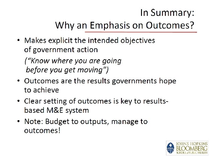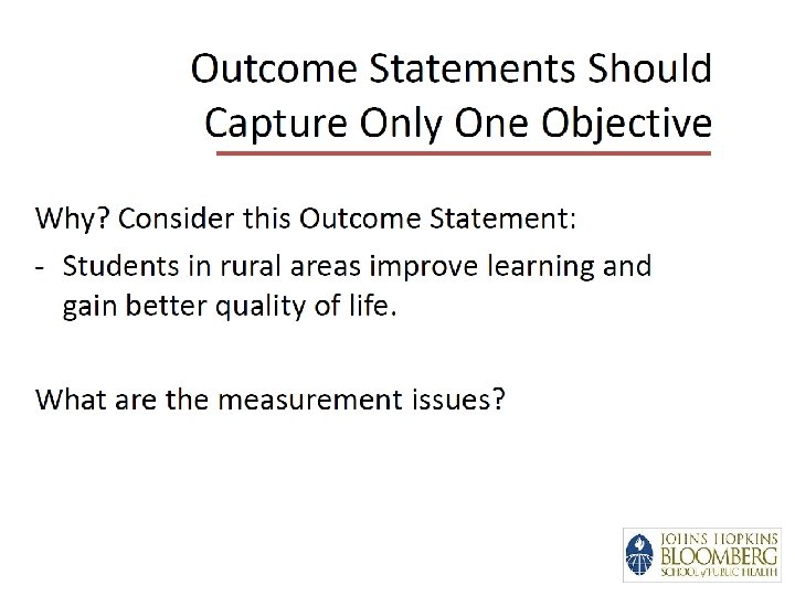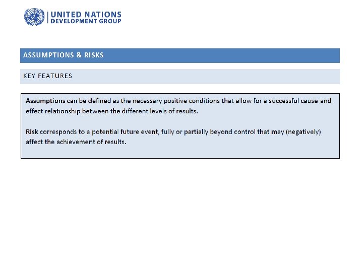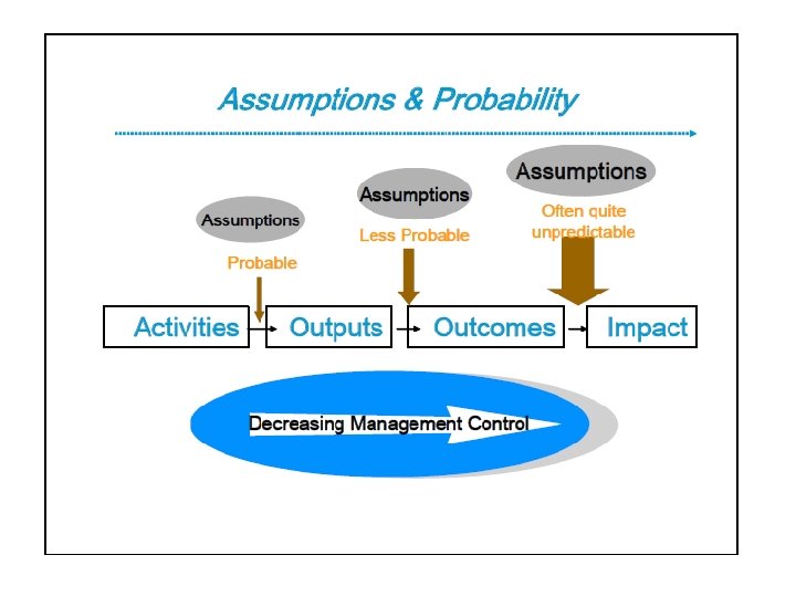 Assumption: A Definition § A necessary condition for the achievement of results at different levels. § Part of the cause-effect logic § Stated as though it is actually the case § Less probable at the higher level of the hierarchy § Can help identify additional results or outputs