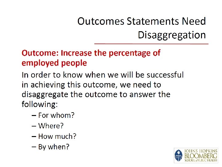 Results Language = Change Language Action Language q expresses results from the provider’s perspective q can be interpreted in many ways q focuses on completion of activities Change Language q describes changes in the conditions of people q sets precise criteria for success q focuses on results, leaving options on how to achieve them
