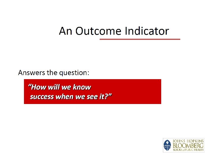 Assessing Change: Indicators § Indicators measure whether results have been achieved § Indicators denote change over time § Indicators illustrate the cause and effect relationships between inputs and results