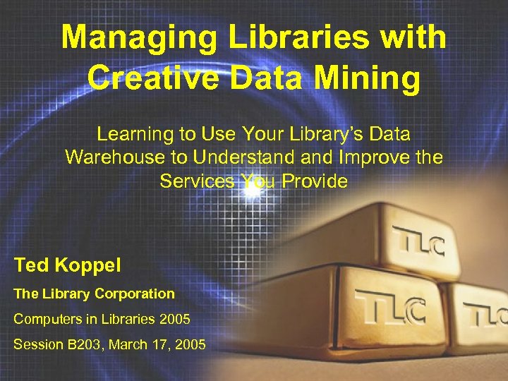 Managing Libraries with Creative Data Mining Learning to Use Your Library’s Data Warehouse to Understand Improve the Services You Provide Ted Koppel The Library Corporation Computers in Libraries 2005 Session B 203, March 17, 2005
