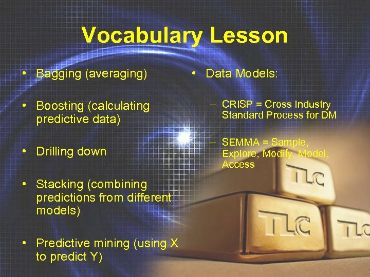 Vocabulary Lesson • Bagging (averaging) • Data Models: • Boosting (calculating predictive data) – CRISP = Cross Industry Standard Process for DM • Drilling down – SEMMA = Sample, Explore, Modify, Model, Access • Stacking (combining predictions from different models) • Predictive mining (using X to predict Y)