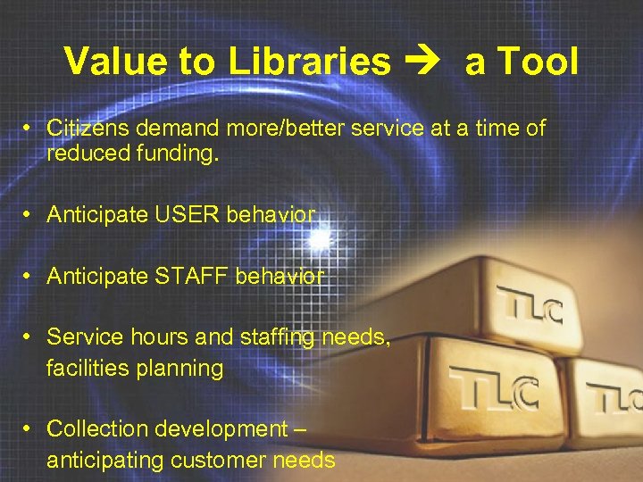 Value to Libraries a Tool • Citizens demand more/better service at a time of reduced funding. • Anticipate USER behavior • Anticipate STAFF behavior • Service hours and staffing needs, facilities planning • Collection development – anticipating customer needs