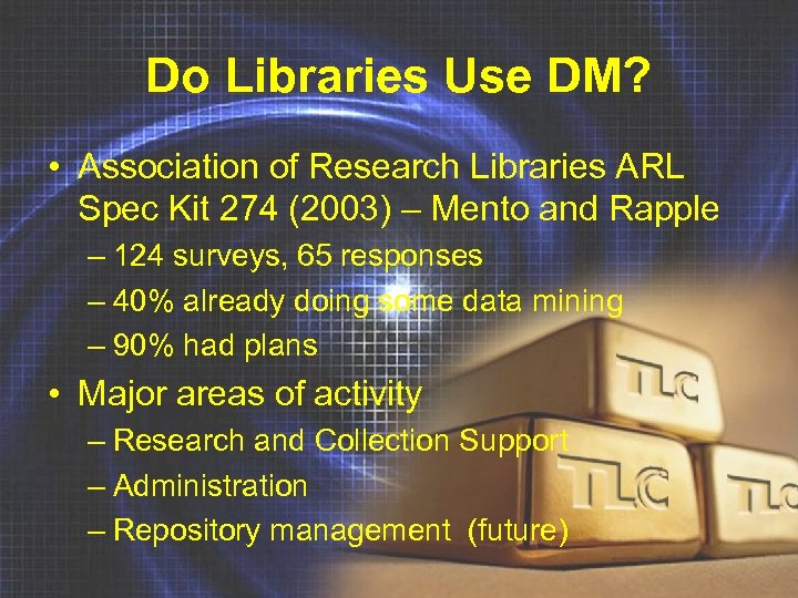Do Libraries Use DM? • Association of Research Libraries ARL Spec Kit 274 (2003) – Mento and Rapple – 124 surveys, 65 responses – 40% already doing some data mining – 90% had plans • Major areas of activity – Research and Collection Support – Administration – Repository management (future)