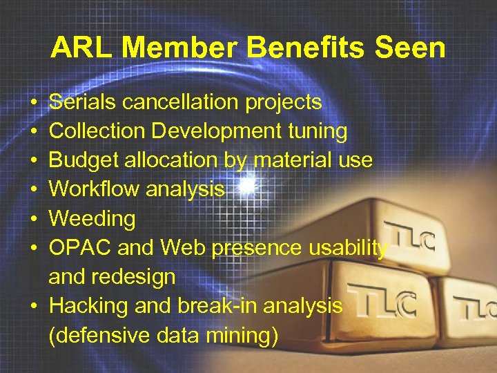 ARL Member Benefits Seen • • • Serials cancellation projects Collection Development tuning Budget allocation by material use Workflow analysis Weeding OPAC and Web presence usability and redesign • Hacking and break-in analysis (defensive data mining)