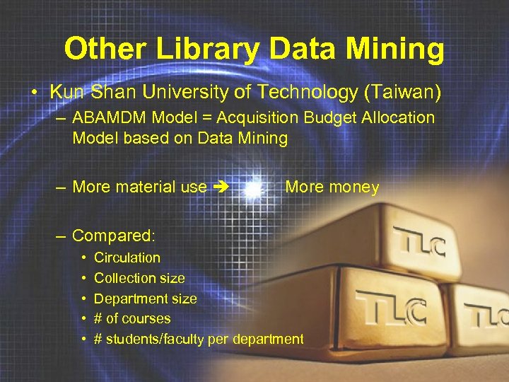Other Library Data Mining • Kun Shan University of Technology (Taiwan) – ABAMDM Model = Acquisition Budget Allocation Model based on Data Mining – More material use More money – Compared: • • • Circulation Collection size Department size # of courses # students/faculty per department