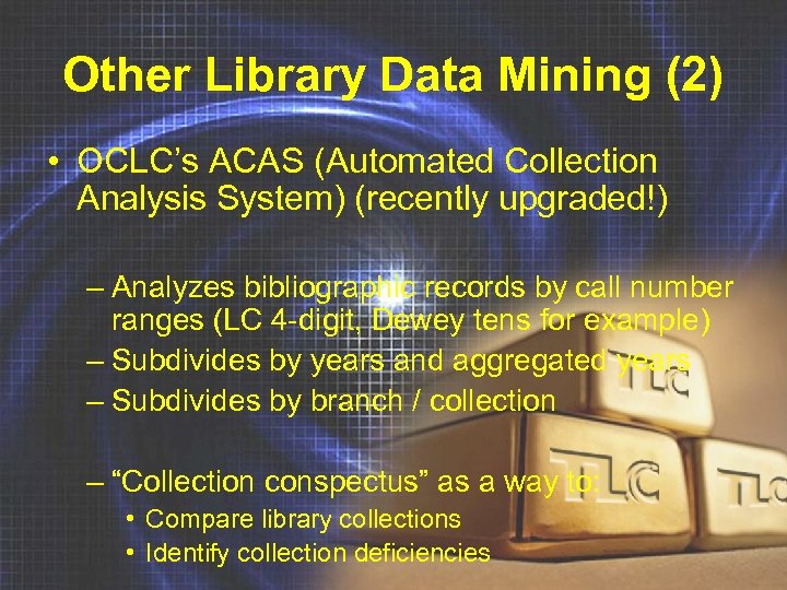 Other Library Data Mining (2) • OCLC’s ACAS (Automated Collection Analysis System) (recently upgraded!) – Analyzes bibliographic records by call number ranges (LC 4 -digit, Dewey tens for example) – Subdivides by years and aggregated years – Subdivides by branch / collection – “Collection conspectus” as a way to: • Compare library collections • Identify collection deficiencies
