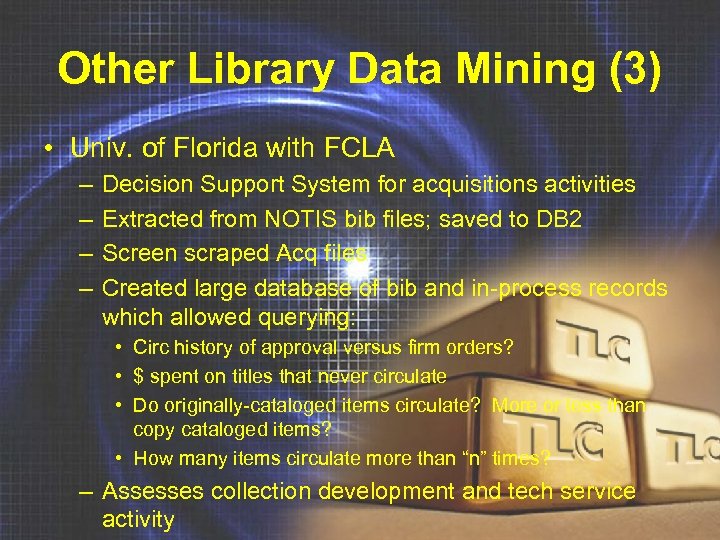 Other Library Data Mining (3) • Univ. of Florida with FCLA – – Decision Support System for acquisitions activities Extracted from NOTIS bib files; saved to DB 2 Screen scraped Acq files Created large database of bib and in-process records which allowed querying: • Circ history of approval versus firm orders? • $ spent on titles that never circulate • Do originally-cataloged items circulate? More or less than copy cataloged items? • How many items circulate more than “n” times? – Assesses collection development and tech service activity