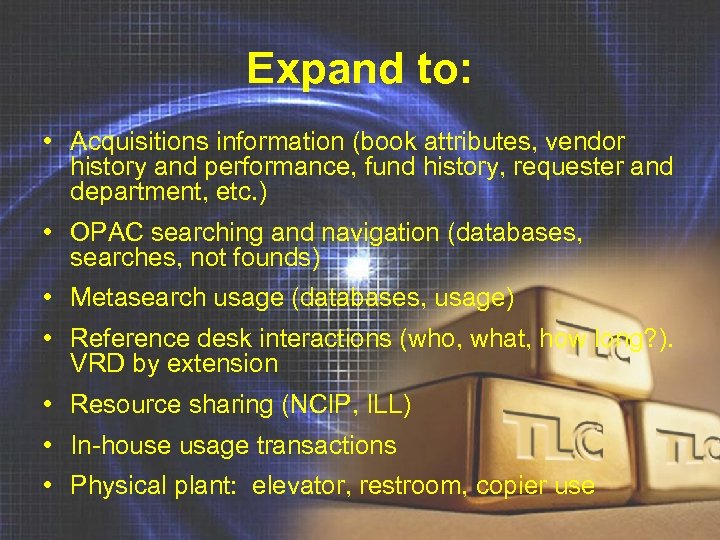 Expand to: • Acquisitions information (book attributes, vendor history and performance, fund history, requester and department, etc. ) • OPAC searching and navigation (databases, searches, not founds) • Metasearch usage (databases, usage) • Reference desk interactions (who, what, how long? ). VRD by extension • Resource sharing (NCIP, ILL) • In-house usage transactions • Physical plant: elevator, restroom, copier use