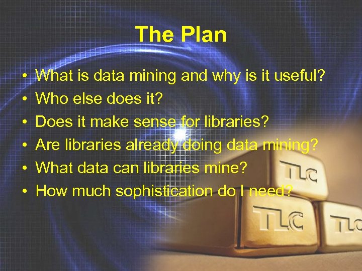 The Plan • • • What is data mining and why is it useful? Who else does it? Does it make sense for libraries? Are libraries already doing data mining? What data can libraries mine? How much sophistication do I need?