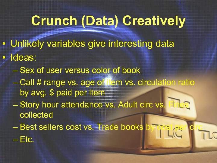 Crunch (Data) Creatively • Unlikely variables give interesting data • Ideas: – Sex of user versus color of book – Call # range vs. age of item vs. circulation ratio by avg. $ paid per item – Story hour attendance vs. Adult circ vs. Fines collected – Best sellers cost vs. Trade books by cost per circ – Etc.