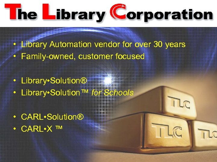 • Library Automation vendor for over 30 years • Family-owned, customer focused • Library • Solution® • Library • Solution™ for Schools • CARL • Solution® • CARL • X ™