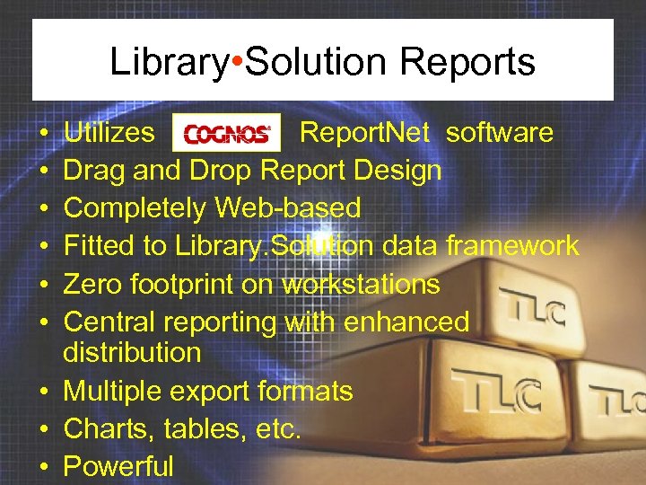 Library • Solution Reports • • • Utilizes Report. Net software Drag and Drop Report Design Completely Web-based Fitted to Library. Solution data framework Zero footprint on workstations Central reporting with enhanced distribution • Multiple export formats • Charts, tables, etc. • Powerful