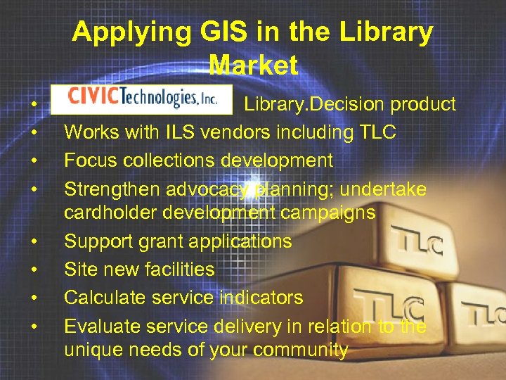 Applying GIS in the Library Market • • Library. Decision product Works with ILS vendors including TLC Focus collections development Strengthen advocacy planning; undertake cardholder development campaigns Support grant applications Site new facilities Calculate service indicators Evaluate service delivery in relation to the unique needs of your community