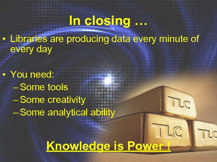 In closing … • Libraries are producing data every minute of every day • You need: – Some tools – Some creativity – Some analytical ability Knowledge is Power !