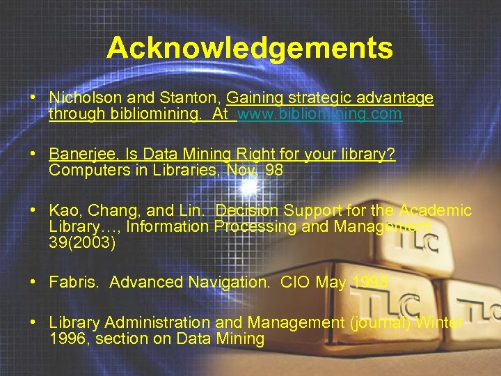 Acknowledgements • Nicholson and Stanton, Gaining strategic advantage through bibliomining. At www. bibliomining. com • Banerjee, Is Data Mining Right for your library? Computers in Libraries, Nov. 98 • Kao, Chang, and Lin. Decision Support for the Academic Library…, Information Processing and Management 39(2003) • Fabris. Advanced Navigation. CIO May 1998 • Library Administration and Management (journal) Winter 1996, section on Data Mining