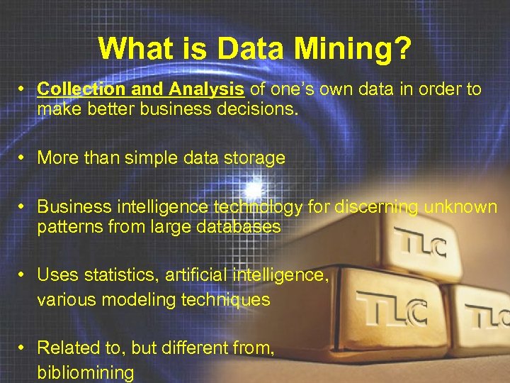 What is Data Mining? • Collection and Analysis of one’s own data in order to make better business decisions. • More than simple data storage • Business intelligence technology for discerning unknown patterns from large databases • Uses statistics, artificial intelligence, various modeling techniques • Related to, but different from, bibliomining