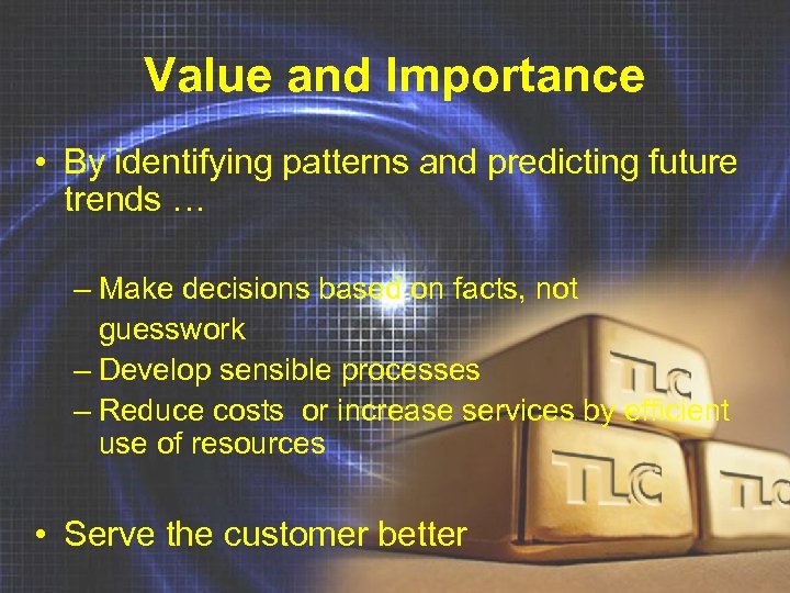 Value and Importance • By identifying patterns and predicting future trends … – Make decisions based on facts, not guesswork – Develop sensible processes – Reduce costs or increase services by efficient use of resources • Serve the customer better